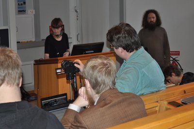 En kamera görs redo för att filma Leigh Honeywells föredrag på FSCONS.